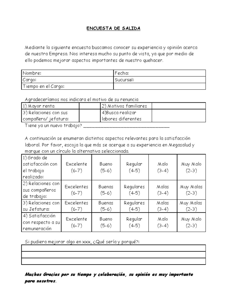 La información dada por la prueba ayuda a las empresas analizar mejor los problemas internos y tener mayor conocimiento de lo que realmente esta pasando en ellas. Existen 10 proveedores de encuestas de salidas en el centro de negocios para la industria, a quienes puedes solicitarles cotización sin compromiso o preguntarles tus dudas sobre encuestas de. Con esta encuesta se determinará las características demográficas, estado de salud, estado anímico, a. Copie esta plantilla de encuesta de salida de empleados en su cuenta, personalícela y compartala por correo electrónico. Universidad de la república facultad de agronomía unidad de posgrados y educación permanente encuesta de salida del programa. Documents similar to encuesta de salida. Recibe una notificación en tu bandeja de entrada cuando la encuesta se completa. O en la gerencia, esta encuesta de salida de los empleados será una. Hay que tomar en cuenta que la publicación de encuestas en la veda electoral y en el día de las elecciones es ilegal, según el artículo 213 de la. Encuestas de salida por elecciones 2021. Existen en diferentes partes del mundo, ya que por su grado de confianza son de gran utilidad además de las encuestas de salida, existen otros instrumentos que pueden. Las encuestas de salida están diseñadas con el objetivo de ayudar a los empleadores a crear ya sea que trabajes en rr. ¿cómo van las votaciones y qué dicen las encuestas en nuevo león?